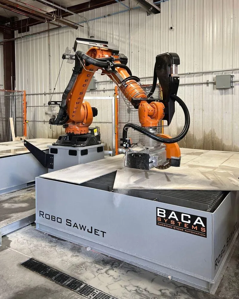 A precision stone fabrication workshop featuring a robotic arm cutting marble. Clean, well-lit industrial space with a luxury craftsmanship aesthetic. Focused on quality and technology, captured in cinematic industrial photography style.
