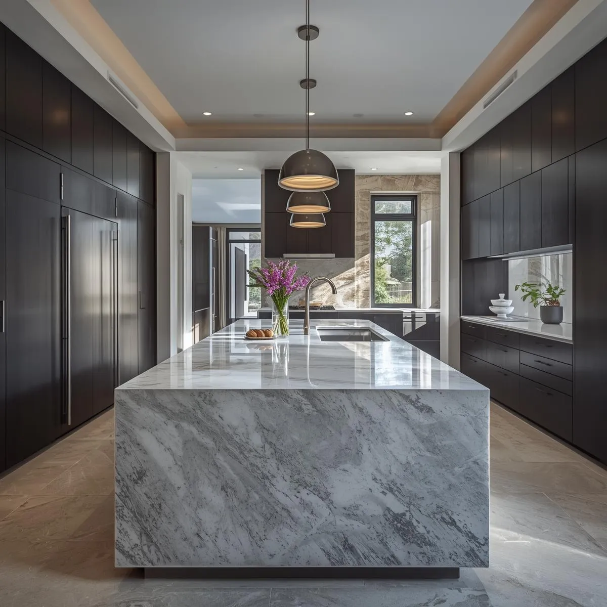 A modern luxury kitchen interior with a large stone island, sleek dark cabinetry, pendant lights, and natural sunlight streaming through windows. Wide-angle shot, high-end real estate photography style, elegant and inviting, shot on a tripod, shallow depth of field, subtle reflections on marble countertops.