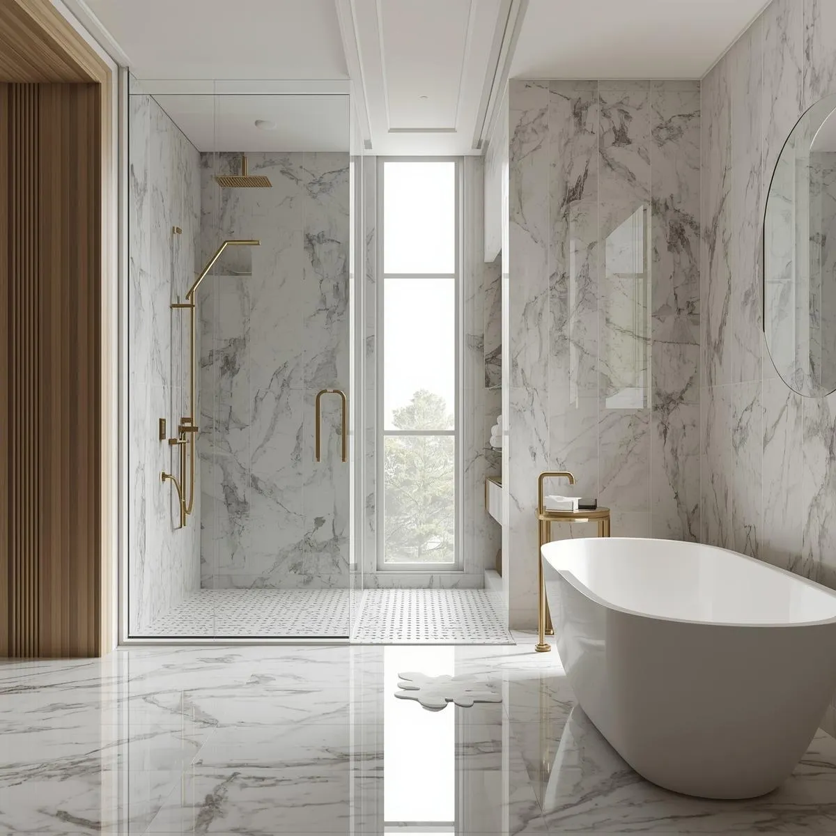 A luxurious spa-inspired bathroom with marble walls and floors, a frameless glass shower, gold fixtures, and soft natural light from a tall window. Minimalist modern design, serene atmosphere, elegant tone, high-resolution architectural photography.