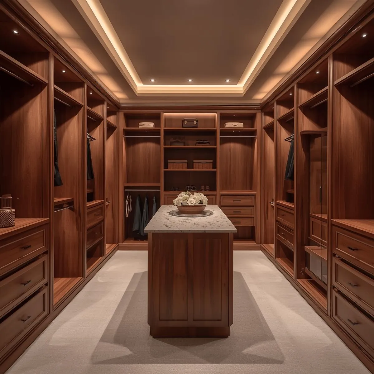 A bespoke walk-in closet made of rich wood with custom shelving, soft recessed lighting, and a center island with drawers.
