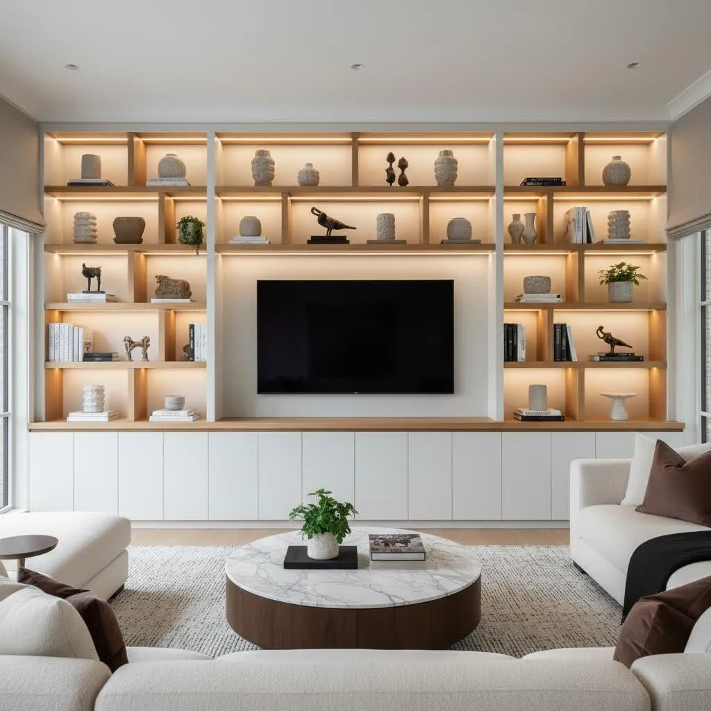 Custom built-in shelving and cabinetry in a luxury living room with integrated lighting, soft white and oak finishes, and curated decor. Wide-angle editorial shot with balanced lighting and an inviting, polished feel.